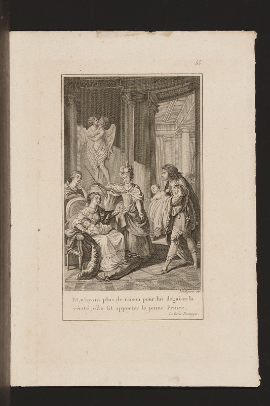 Scène d'intérieur, la reine, à gauche, assise sur un fauteuil, tient un nourrisson sur ses genoux. Elle tend le bras gauche vers un autre enfant que lui apporte un homme. Deux femmes entourent la reine. En arrière-plan, statue de deux anges se baisant la bouche.