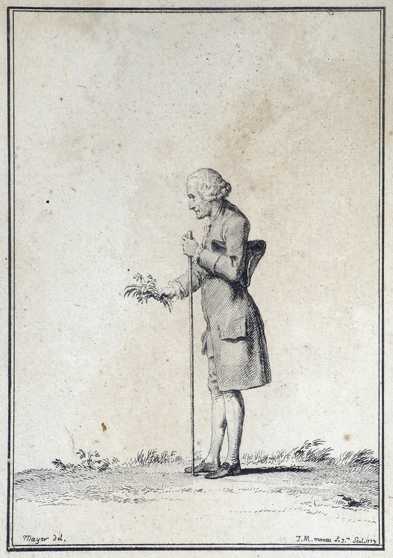 Portrait en pied de Jean-Jacques Rousseau de trois-quarts à gauche, en habit à la française. Il est tête nue, perruque ronde, son tricorne sous le bras gauche, tenant sa canne de la main gauche, un bouquet de fleurs (pervenches ?) de la droite