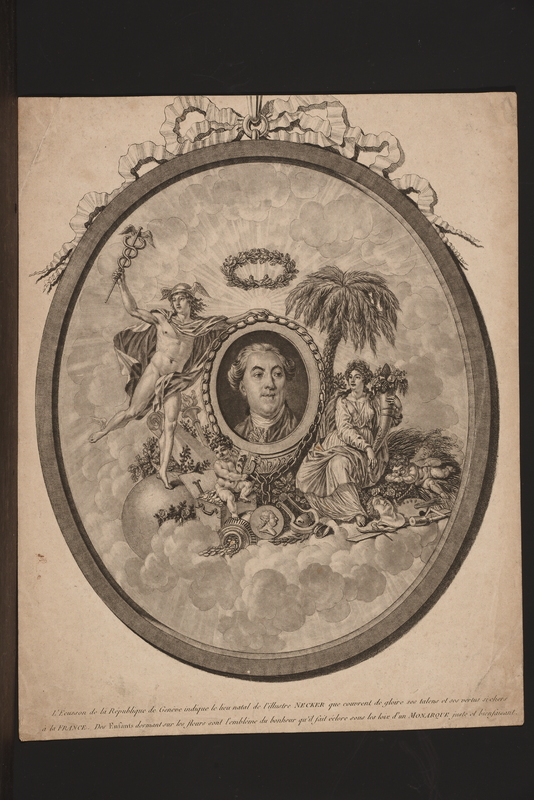 Grande estampe avec le portrait de Necker, de face légèrement à droite, au centre en médaillon. Celui-ci est entouré d'un collier où pend une médaille représentant Louis XVI de profil. Un vaste cadre ovale suspendu à une boucle ornée d'un ruban noué contient des nuées et le médaillon central surmonté d'une couronne et flanqué à gauche de Mercure sur le globe terrestre avec les attributs de la richesse (coffre et urne débordant de pièces) et de Cérès sous un palmier tenant une corne d'abondance et assise sur les attributs de l'abondance (gerbes) et des arts. Des amours dorment dans les gerbes. Un amour assis sous le portrait tient les armes de Genève.