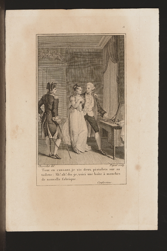 Dans une chambre, un couple enlacé [Zulietta et Jean-Jacques] regarde une paire de pistolets posés sur une table de toilette. [A gauche,] un soldat coiffé du tricorne et portant épée les regarde, appuyé sur une canne. [Le trumeau de la porte est couronné d'une Léda et le cygne].