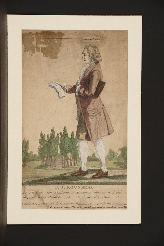 Portrait en pied de Jean-Jacques Rousseau de profil gauche. Au seconf plan, l'ìle des Peupliers à Ermenonville avec son tombeau. Il tient dans sa main droiteune liasse de feuilles intitulée "Contrat salutaire" [sic], sous son bras gauche son tricorne. Au-dessus de sa tête brille une auréole entourant le texte «l'Homme Phénix».