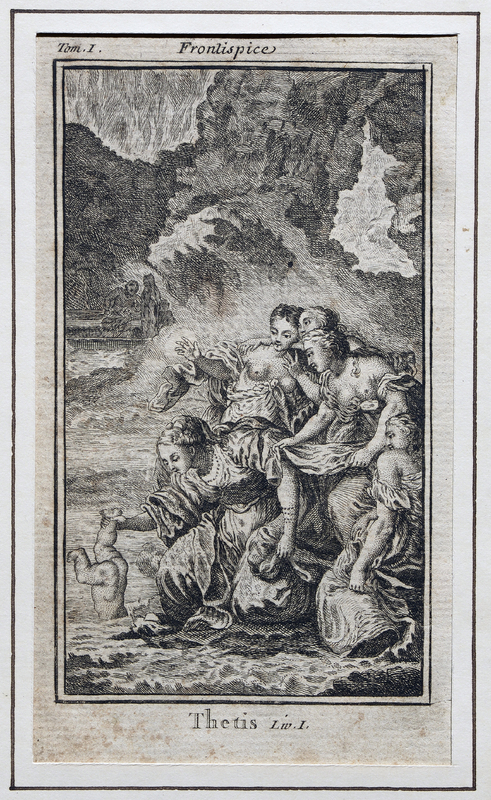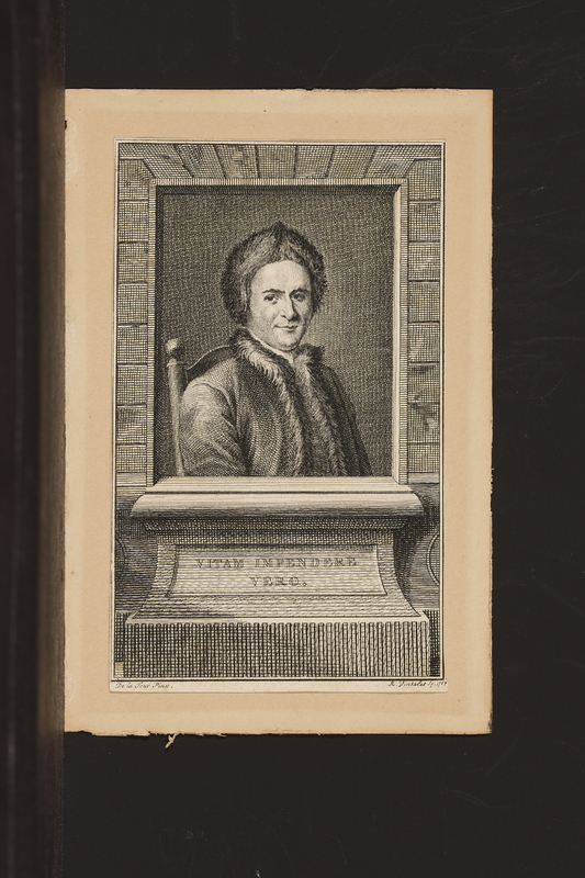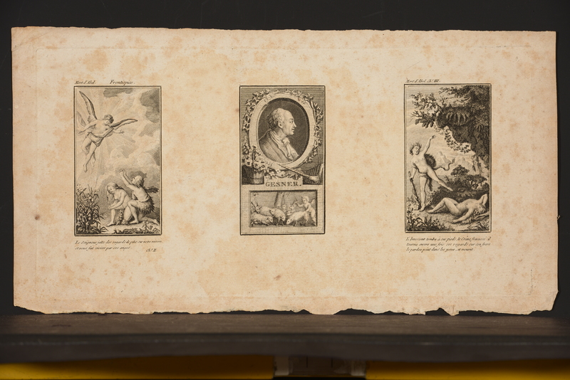 Plaque de cuivre groupant trois gravures de mêmes dimensions. Le frontispice de gauche, intitulé «Mort d'Abel», montre Adam et Eve agenouillés et suppliant un ange qui sort des nuées. Au centre, un portrait de Gessner, en buste de profil droit dans un cadre ovale orné de lierre. La gravure de droite montre un paysage de rochers ornés de lierre, de buissons et de plantes fleuries avec quelques montagnes dans le fond. Un homme nu est tombé à terre sur le dos (Abel), tandis qu'un autre personnage (Caïn) vêtu d'une peau de bête et armé d'une massue s'éloigne en lui faisont signe.