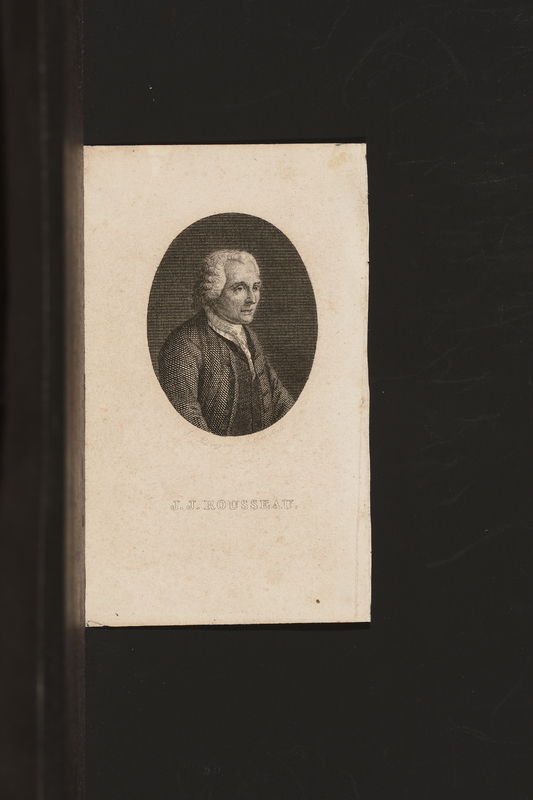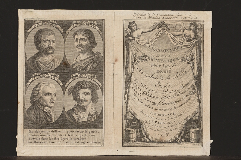Page de titre précédée d'un frontispice formé de portraits en médaillon de «Junius Brutus», «Mutius Scevola», «J.J. Rousseau» (de trois-quarts à droite), «Guillme Tell», placés deux par deux et les uns sous les autres sur un fond noir.