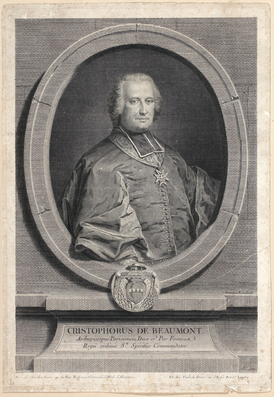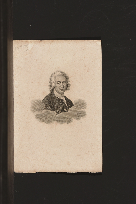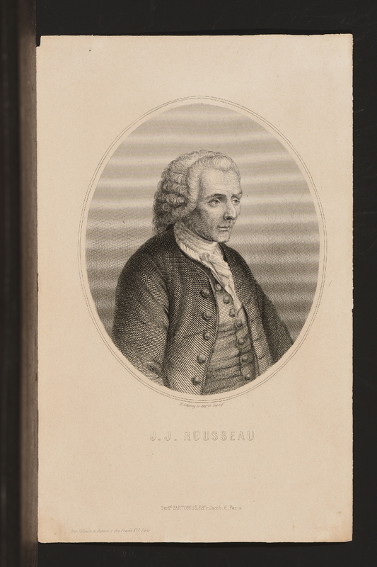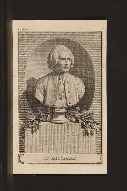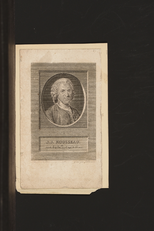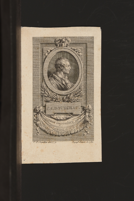 Portrait de Rousseau en buste de profil droit. Tête nue, coiffure à la romaine, dans un cadre ovale, attaché par un nœud à un cadre rectangulaire gravé. Sous l'ovale des branches de laurier. Au-dessous du cartouche, une draperie à franges.