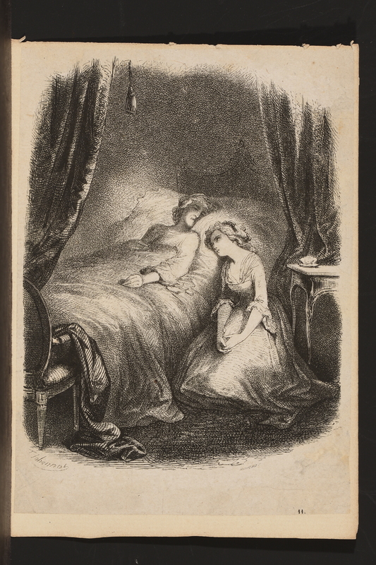 Julie sur son lit de mort, une jeune fille, les mains jointes, est agenouillée à droite du lit, la tête appuyée sur l'oreiller.