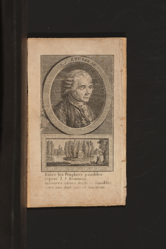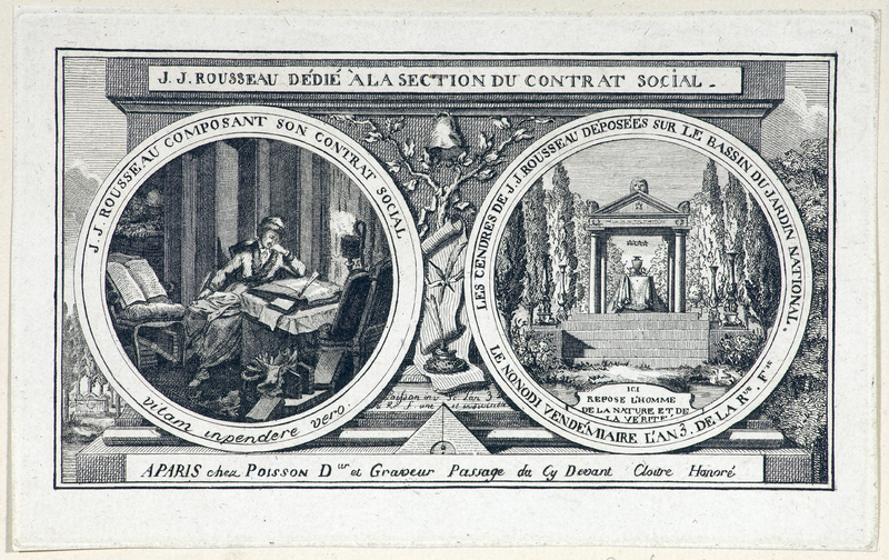Autour de celui de dr.: «LES CENDRES DE J.J. ROUSSEAU DÉPOSÉES SUR LE BASSIN DU JARDIN NATIONAL. / LE NONODI VENDÉMIAIRE L'AN 3. DE LA RUE . FSE» et en pied de la vignette: «ICI / REPOSE L'HOMME / DE LA NATURE ET DE / LA VÉRITÉ»