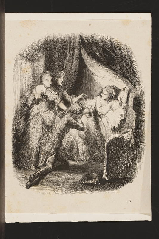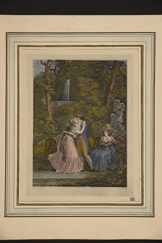 A genoux devant le lit de Julie, Saint-Preux baise la main gauche de la malade. Deux femmes tentent de le retenir. L'une d'elles tient de la main droite un bougeoir avec une chandelle allumée.
