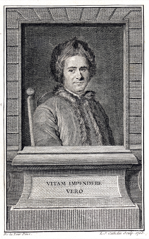 Portrait en buste de Rousseau d'après La Tour, assis sur "une chaise paillée", presque de face, le corps tourné de trois-quarts vers la droite, en habit dit arménien avec bordure et bonnet de fourrure.