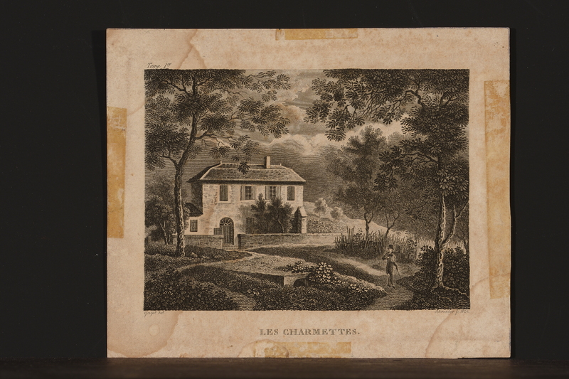 La maison des Charmettes, presque de face, entourée d'arbres, sous un ciel nuageux. Au centre, au premier plan, un soupirail. Sur le sentier, à droite, un homme lisant, canne à la main, coiffé d'un haut-de-forme.