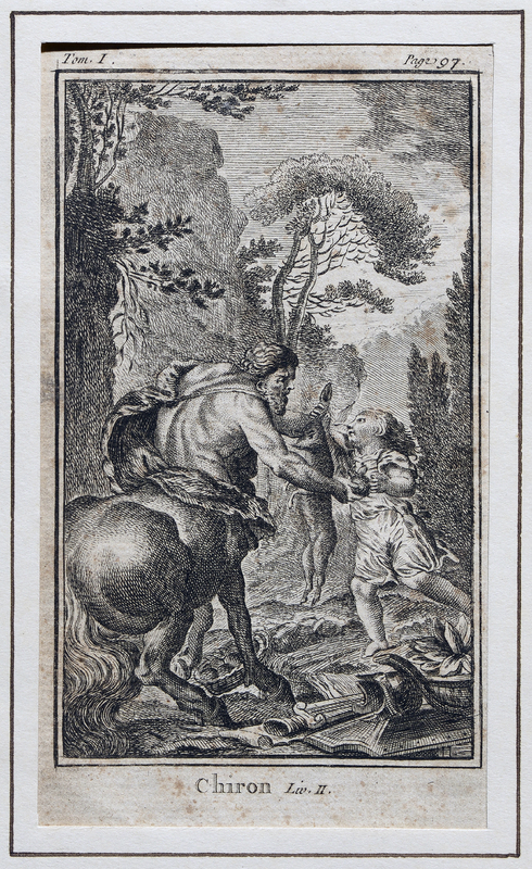Image pour l'édition Jean Néaulme de l'Emile de 1762 Le centaure Chiron exerçant le petit Achille à la course.