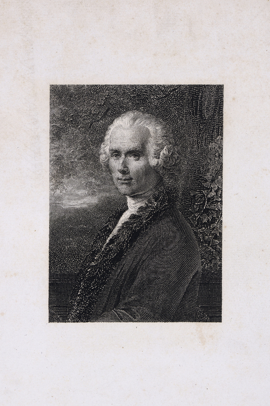 Portrait de Rousseau en plan américain, de profil, tête presque de face tournée à gauche, portant un habit bordé de fourrure
