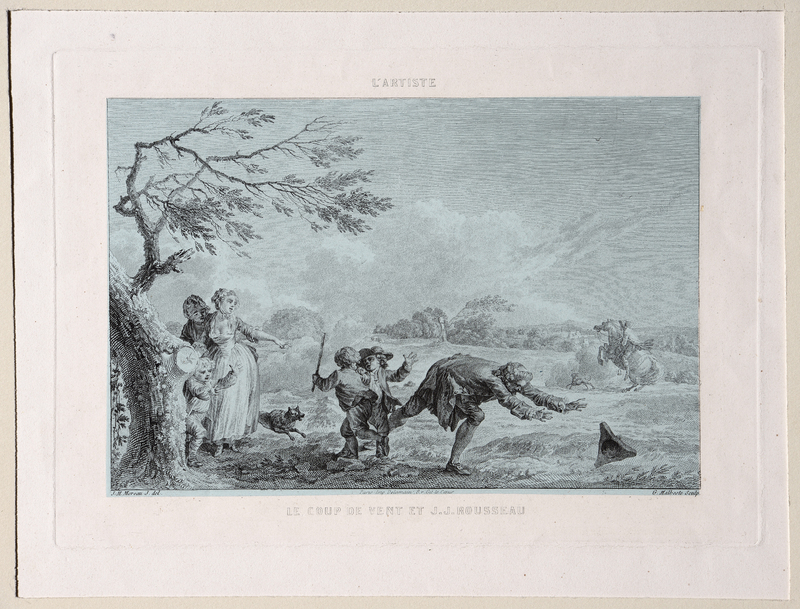 J.J. Rousseau courant après son chapeau tricorne. Sur fond imprimé en bleu pâle.