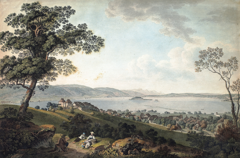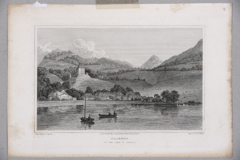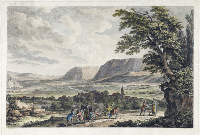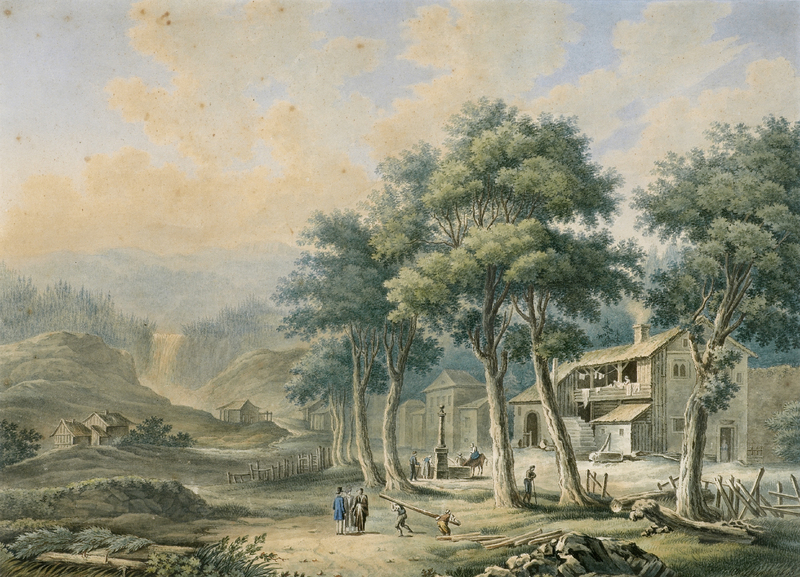 Reprise de la «III.E VUE DU VILLAGE DE MOUTIERS-TRAVERS, / avec la maison de J.J. Rousseau, et la Chûte du Torrent qui est dans les environs, / A.P.D.R.», Tableaux de la Suisse N° 84.