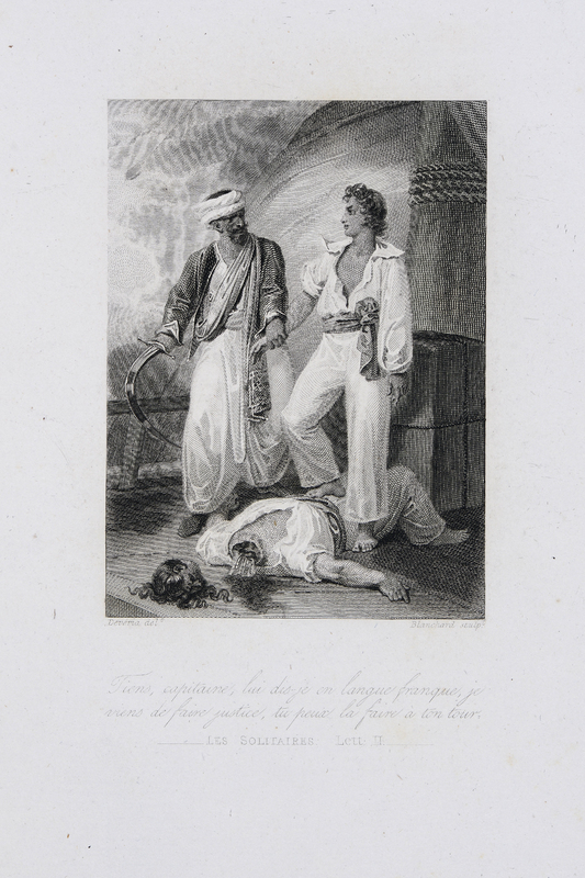Un Arabe tenant un cimeterre tient un jeune homme par le poignet droit ; celui-ci a le pied dripoit posé sur le corps d'un homme gisant, la tête tranchée.