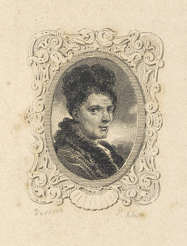 «En dépit de la note "gravé sur acier par Hopwood d'après le buste de Houdon.", le dossier de la chaise lui donne plutôt pour origine le pastel de La Tour.» (FM)