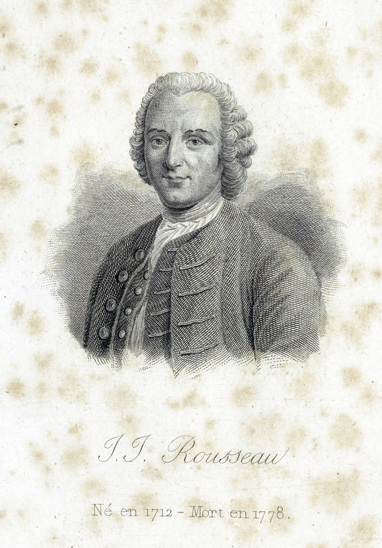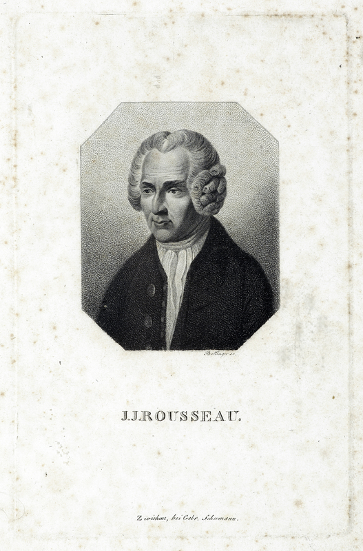 Au-dessous, un cartouche gris foncé porte en lettres grises: J.J. Rousseau. Un cadre, strié horizontalement, et entouré d'un trait carré contient le tout.»