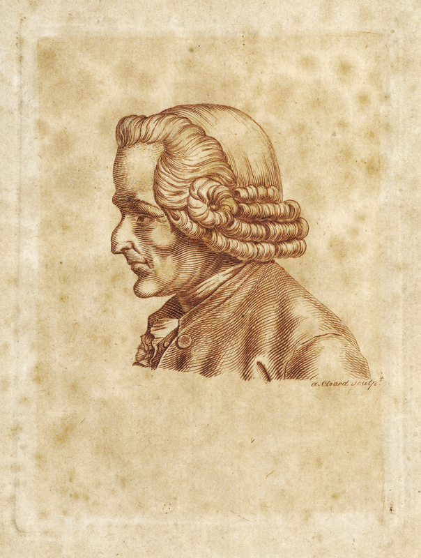 Portrait de Rousseau portant «l'habit du "citoyen de Genève"; il est représenté visage et corps tournés de trois-quarts vers la droite.