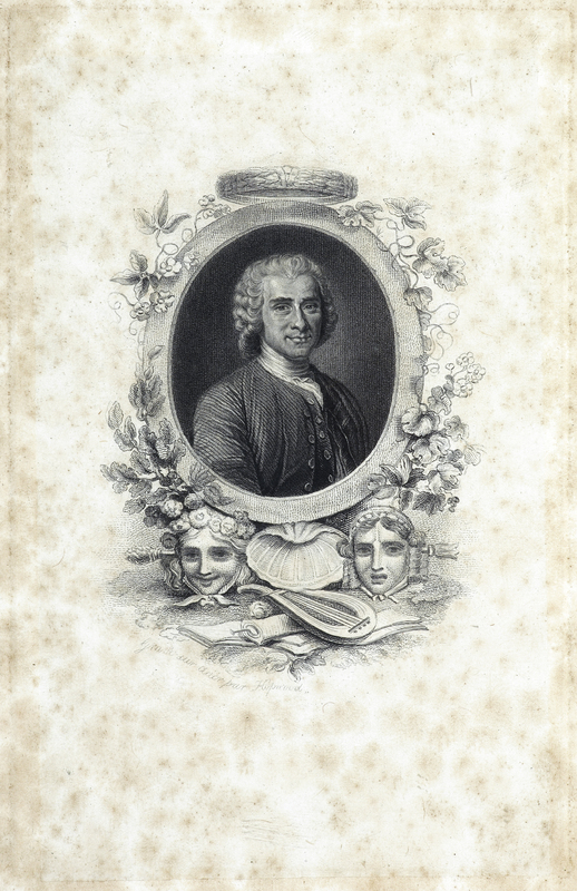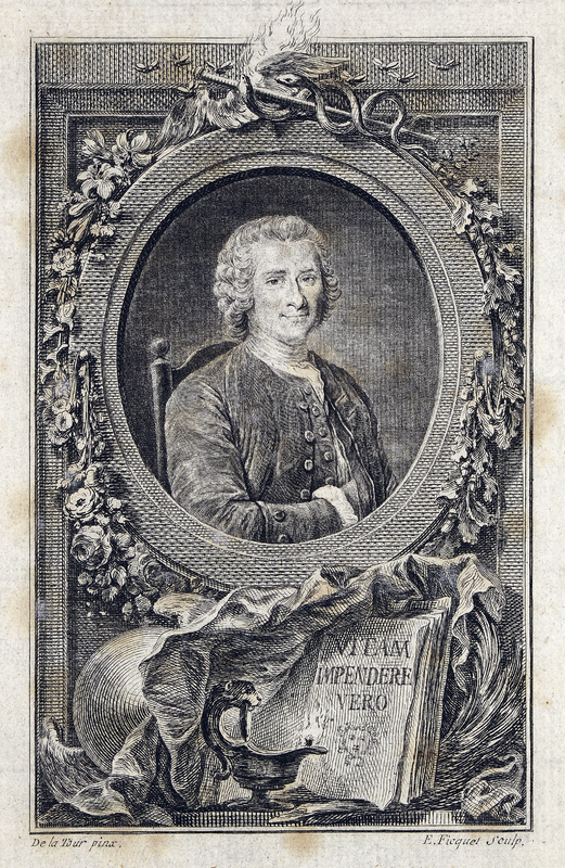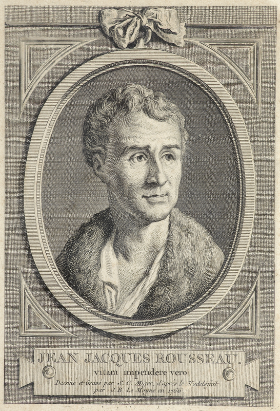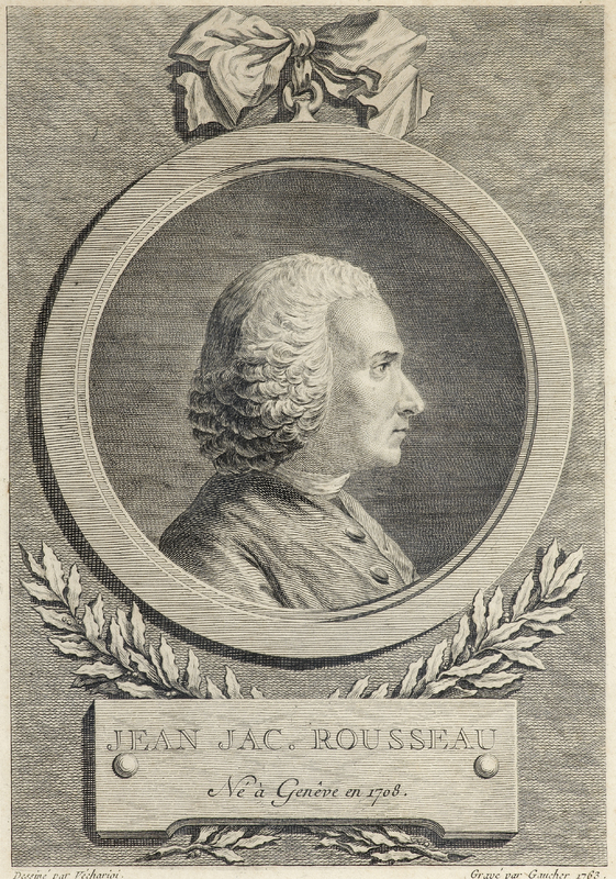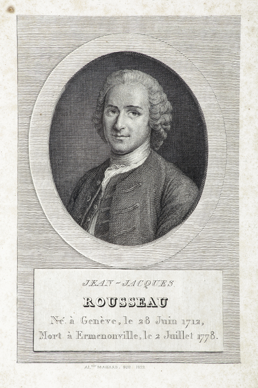 J.J. Rousseau en chemise ouverte avec col de fourrure (dans un cartouche ovale).