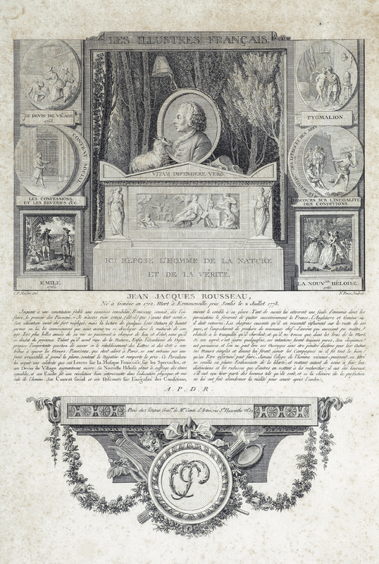 «Le portrait de Rousseau (tête nue, de profil à gauche [évoquant Vécharigi]) figure au cœur d'un tableau où l'artiste a évoqué des scènes tirées des œuvres principales du philosophe, et a dessiné le tombeau où il fut déposé.