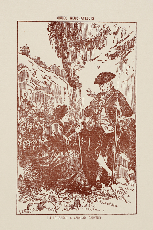 Portrait d'Abraham Gagnebin (1707-1800) herborisant avec Rousseau assis à gauche dans un paysage de rochers.