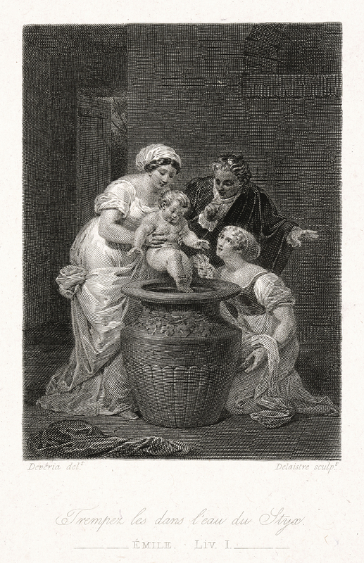 Une femme accompagnée d'un homme et d'une femme plongeant un enfant dans un vase. Imprimé sur Chine