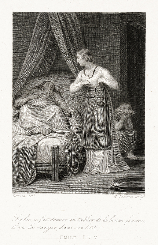 Une femme alitée, une autre s'attachant un tablier, tout à droite une fillette la tête entre les mains. Imprimé sur Chine