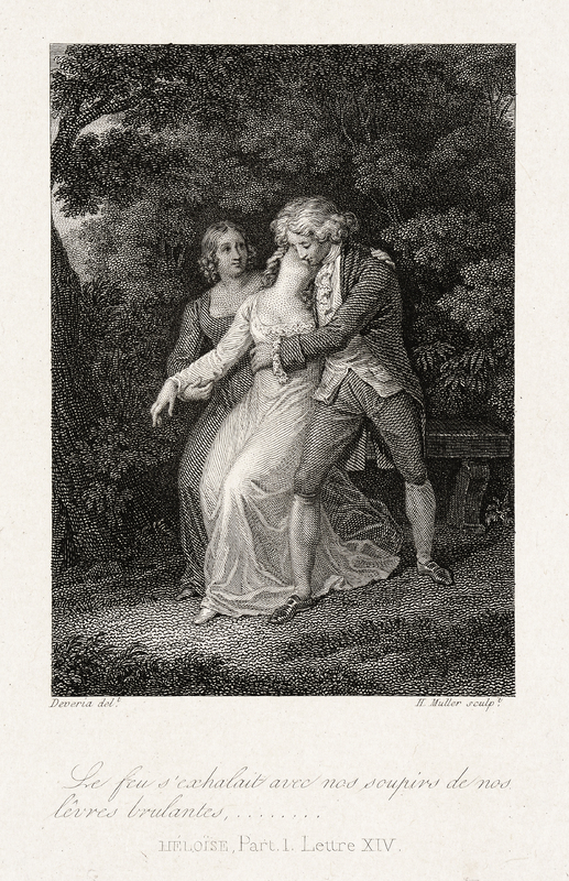 Couple embrassé dans un bocage près d'un banc, une femme à leur droite. Imprimé sur Chine