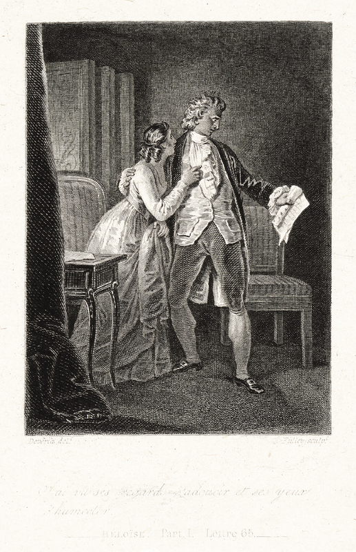 Dans un salon, une femme s'accroche à un homme qui tient une liasse de feuilles écrites de la main gauche. Imprimé sur Chine.