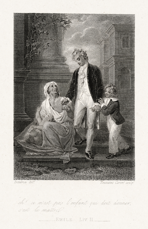 Un homme tenant un enfant de la main gauche donne une pièce de monnaie à une mendiante accroupie avec un bébé. Imprimé sur Chine.