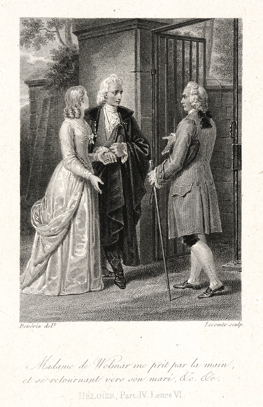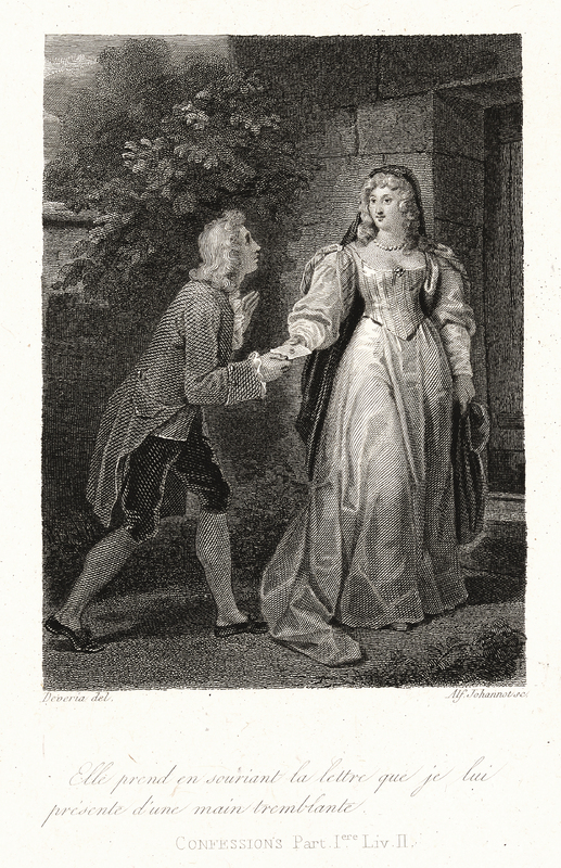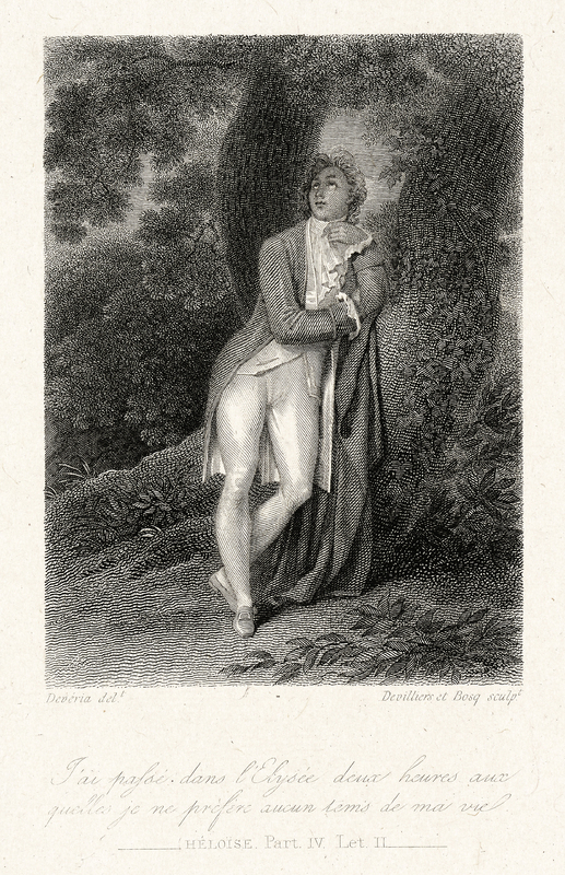 J. J. Rousseau en pied, en habit à la française, devant un socle représentant son propre tombeau sur l'île des Peupliers.