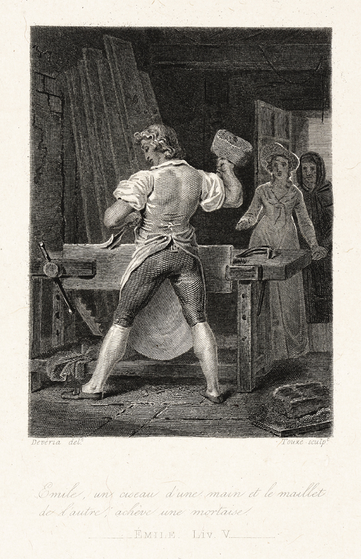 Homme à l'établi, regardé par deux visiteuses Imprimé sur Chine.