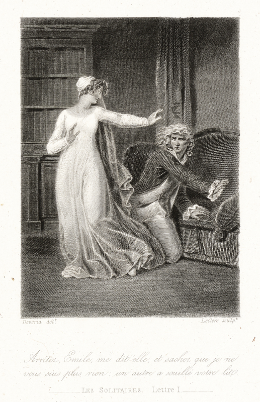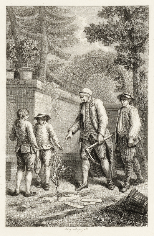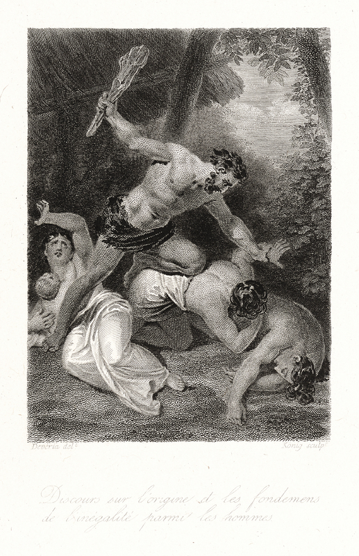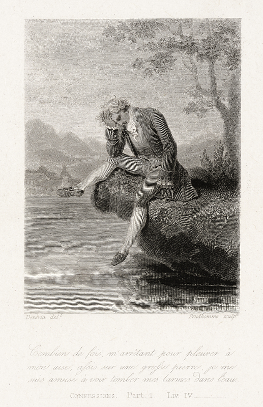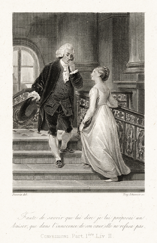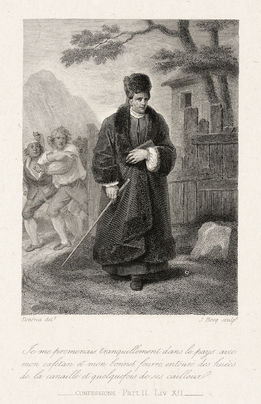 Dans un parc, sur une terrasse, Rousseau en habit français mais coiffé du bonnet et appuyé sur une canne rustique qu'il tient de la main gauche, s'avance vers un couple à l'allure très aristocratique (à g.).