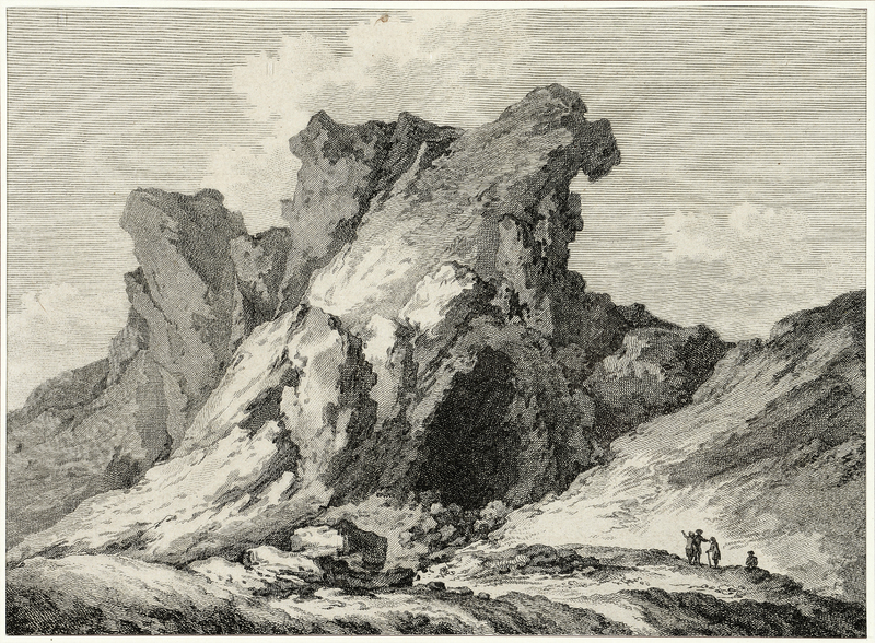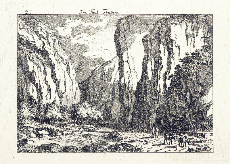 Reprise de «II.me Vue des rochers de Moustiers-Travers. / Comté de Neuchatel. / A.P.D.R.» «Tableaux de la Suisse», Laborde et Zurlauben, Paris, 1780-1786, N°96 bas.