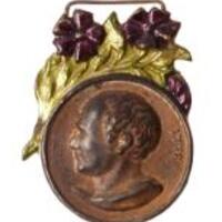 Petite médaille pour être suspendue à un ruban: portrait à la romaine de profil à gauche, tête nue et à droite, dates: 1878 à g., 1778 à dr. La pièce est rehaussée d'une branche de pervenches, feuillage vert et fleurs violettes.