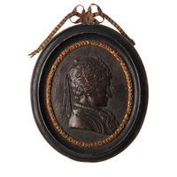 Médaillon en bronze, uniface, sans légende, buste de Rousseau, en habit arménien à mi-corps, de profil à droite avec un bonnet d'Arménien, avec un lacet pendant, dim. : intérieur. 58 x 46