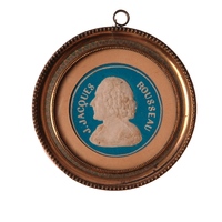 Médaillon rond, en cuivre, buste de Rousseau à la française, tourné à gauche, tête nue, perruque, « J. Jacques Rousseau » relief en papier gaufré imitant une céramique bleue de Wedgewood, dim. : 76,5 de diamètre.