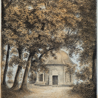 «[Sur l'Ile de Saint-Pierre, u]ne allée sous les arbres mène au pavillon. La porte au centre est ouverte; la fenêtre de g. est également ouverte, celle de dr. est fermée, les volets en sont ouverts.» (FM)