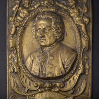 «Le buste de Rousseau, tourné de trois-quarts à g., habit du "citoyen de Genève", apparaît en fort relief dans un cadre ovale. Le cadre orné est surmonté d'une couronne de laurier que deux angelots ' s'appuyant de part et d'autre sur la courbe du cadre ' tiennent à bras tendu. Chacun tient en outre une trompette (celui de dr., embouchure levée, celui de g. renversée). Le cadre est entouré de volutes et de chaque côté descend une branche de laurier. Les volutes se rejoignent sous le cadre qui repose sur une tête d'ange ' la face entre deux ailes déployées ' qui tient dans ses mains des palmes.
