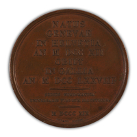 Revers: NATUS | GENEVAE | IN HELVETIA | AN M DCC XII | OBIIT | IN GALLIA | AN M DCC LXXVIII | SERIES NUMISMATICA | UNIVERSALIS VIRORUM ILLUSTRIUM | M DCCC XIX | DURAND EDIDIT.