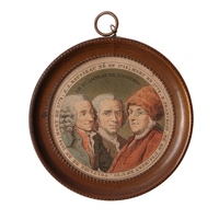 Médaillon rond à suspendre, diamètre : 79,4, formant cuvette dans laquelle on a placé l'image de 3 personnages entourés d'une inscription : Voltaire né en 1694 ; mort en 1778. J.J. Rousseau né en 1712 ; mort en 1778. B. Francklin, né en 1706 ; mort en 1790. Les 3 personnages sont représentés à hauteur de poitrine, à gauche, Voltaire de ' à droite, en perruque, au centre, Rousseau légèrement tourné à droite, en perruque, à droite, Franklin, de ' à gauche, coiffé d'un énorme bonnet, le nez chaussé de ses lorgnons. Une inscription en arc au-dessus des 3 personnes : Le flambeau de l'univers. Dim. de la gravure : 50,5, au 2e trait : 56,2. La gravure est en couleurs, Voltaire apparaît sous les couleurs bleu pour l'habit, rouge pour le gilet et blanc pour la chemise, Rousseau, au centre a un habit brun et la chemise et le col serré blanc, Franklin est vêtu de brun rouge. Cadre de cuivre, épaisseur, 85 mm