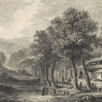 «III.E VUE DU VILLAGE DE MOUTIERS ' TRAVERS, / avec la maison de J. J. Rousseau, et la Chute du Torrent qui est dans les environs. / A.P.D.R.» [«Tableaux de la Suisse», Laborde et Zurlauben, Paris, 1780, No 84]