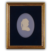 Biscuit blanc genre Wedgwood à fond bleu roi, copie d'une pièce du XVIIIe siècle à l'occasion de la commémoration du 250e anniversaire de la naissance de J.J. Rousseau. Sur velours marine foncé; cadre en bois doré.