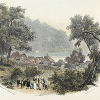 Vue des hauts de Clarens, avec perspective sur le lac et Chillon. Groupe de 7 personnages, hommes (en tenue du XVIIIe siècle), femmes et enfants avec 2 chèvres. «~ "Nouvelle Héloïse" été 1754» (FM).