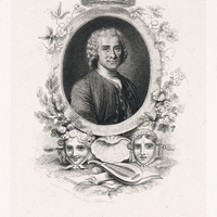 Portrait inspiré du pastel de La Tour, avec les attributs de la Musique, de la Comédie et de la Tragédie.