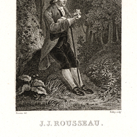 - Debout, appuyé à un arbre, le bras gauche reposant sur sa canne et tenant un bouquet de pervenches.