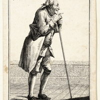 Homme âgé penché sur sa canne, le tricorne sous le bras droit.