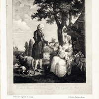 Devant lui, assise sur un tertre [au pied d'un arbre], une femme donne le sein au bébé qu'elle tient sur ses genous. Elle est tournée de trois-quarts à g. Un autre enfant arrive en courant entre elle et Rousseau. Il montre le philosophe de la droite, et regarde sa mère. Un panier de fruits est posé à côté de la femme à droite. A gauche, devant Rousseau, un agneau tète sa mère.