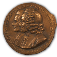 Avers: bustes de Voltaire et Rousseau, en perruque, profils superposés à gauche, haut-relief. Inscription sur le pourtour. Signé à g.; sous l'épaule de Voltaire: 1823. Revers: relief en creux (la pièce n'a pas été ébarbée).