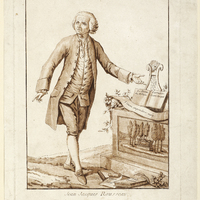 J. J. Rousseau en pied, en habit à la française, devant un socle représentant son propre tombeau sur l'île des Peupliers.
