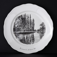 Assiette blanche à marli festonné dont le bassin représente l'Ile des Peupliers à Ermenonville avec le cénotaphe de J.J. Rousseau